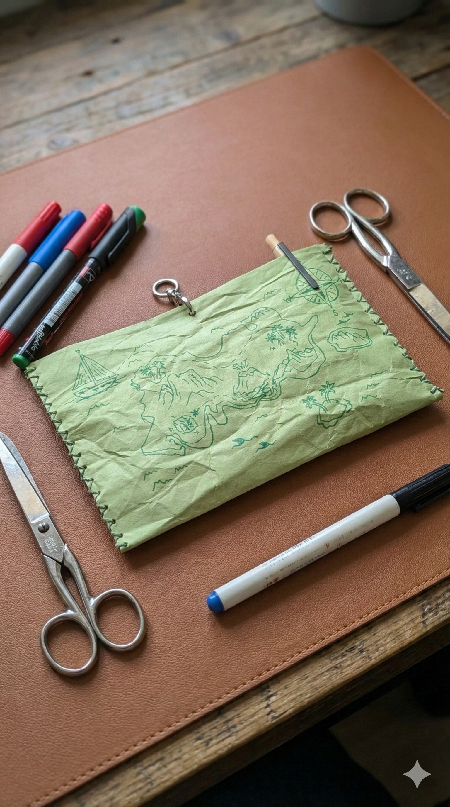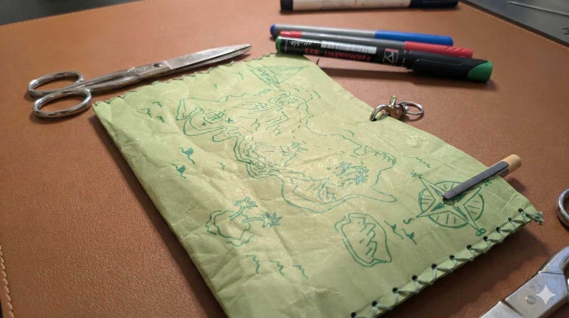 Es ist keine Tasche. Es ist eine Hülle aus Papier – einem Material, das aussieht wie Papier, aber reißfest, wasserresistent und extrem leicht ist. Es ist das Material, aus dem Seekarten und Führerscheinpapiere gemacht sind.
